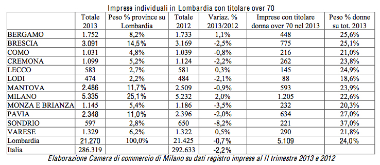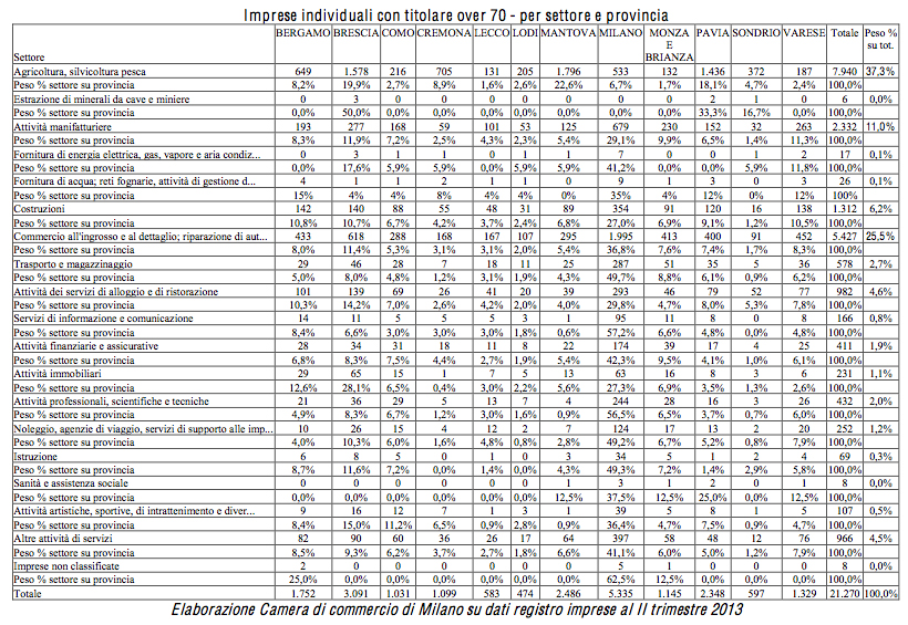 “La Lombardia – si legge nel riassunto dello studio – conta 21.270 imprenditori ultrasettantenni titolari di impresa individuale, di cui il 24% donne (pari a 5.109 titolari). Sono oltre 286mila in Italia gli imprenditori ultrasettantenni, di cui il 27,1% (77.573 titolari) è donna. Gli imprenditori over 70 sono diffusi soprattutto nel settore agricolo (63,2%), del commercio (16,8%) e nelle attività manifatturiere (4,9%). Roma è prima nella classifica delle province italiane per numero di ditte individuali con titolare ultra settantenne (12.434 imprese, 4,3% del totale Italia), seguita da Napoli (8.404 imprese, 2,9%) e Bari (8.169, 2,9%). Tra le regioni guidano la Sicilia con 30.530 imprese (10,7% italiano), l’Emilia – Romagna (26.422, 9,2%) e il Veneto (26.209, 9,2%)”.