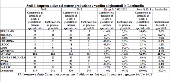 Con 189 attività commerciali (37% del totale regionale ) e 100 imprese manifatturiere (41%) Milano è il capoluogo lombardo dei giocattoli. Seconda per numero di esercizi commerciali è Bergamo (14%), seguita da Varese (10,1%). Cremona si colloca al nono posto, con 3,5%. In calo del 10% nel nostro territorio le imprese attive nel commercio al dettaglio ed esercizi specializzati.