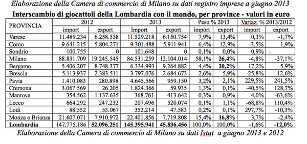 Anche le importazioni sono in calo: nella prima metà del 2013 sono arrivati in Lombardia giocattoli per oltre 145 milioni di euro (-1,6%) provenienti per il 37,8% dalla Cina. A Cremona in particolare l’importazione di giocattoli è calata del 40%, passando da un valore di 3.076.569 euro del 2012 a 1.824.366 euro del 2013. Sono invece aumentate le esportazioni, che sono passate da 26.205 euro nel 2012 a 59.935 euro nel 2013 (+128%).