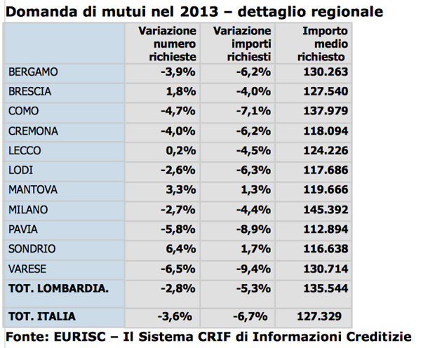 A livello nazionale, dall’ultima edizione del Barometro Crif, che analizza l’andamento delle domande di mutui e prestiti contribuite dagli istituti di credito in Eurisc (il Sistema di informazioni creditizie di Crif che raccoglie i dati relativi ad oltre 77 milioni di posizioni creditizie), emerge che il numero di richieste di mutui nell’arco dell’intero 2013 ha fatto registrare una contrazione del -3,6% rispetto all’anno precedente anche se a partire dal luglio scorso si è verificata una inversione del trend, con gli ultimi 6 mesi del 2013 che consecutivamente si sono chiusi in positivo.