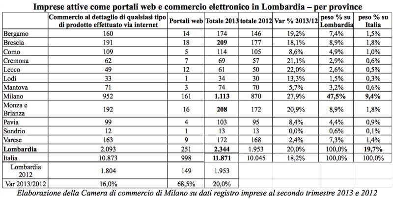 Oltre 2300 imprese attive in Lombardia tra portali web e aziende che vendono online, il 19,7 per cento delle imprese del settore presenti in Italia. Sono i numeri relativi al 2013 contenuti in una elaborazione condotta dalla Camera di commercio milanese su dati registro imprese al secondo trimestre 2013 e 2012. Analisi che mette in evidenza il boom della provincia di Cremona: +21,1 per cento in un anno (da 57 a 69). Solo Milano e Lecco crescono di più rispetto al 2012. L’incremento del numero di imprese attive su internet prosegue sulla linea positiva già registrata negli anni scorsi.
