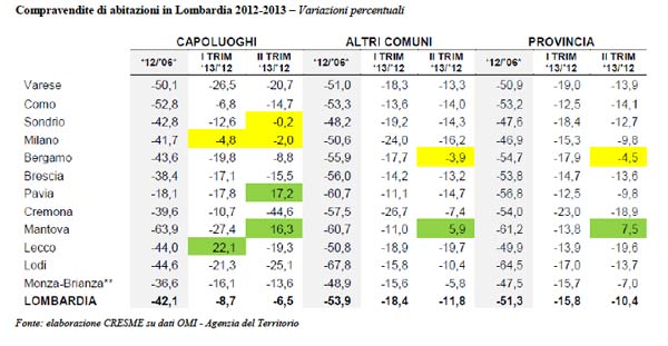 Se è vero che in Lombardia la crisi nel settore immobiliare sta rallentando, pur essendo ancora ben lontana dalla parola fine, a Cremona i numeri sono ancora decisamente negativi. Nella città di Cremona le compravendite di abitazioni sono calate del 39,6% dal 2006 al 2012, mentre il calo è stato del 54% in tutta la Provincia. Nel primo trimestre 2013 invece, il calo per Cremona, rispetto al 2012, è stato del 10,7% per la città e del 23% per tutta la Provincia. Nel secondo trimestre si parla invece di un -44,6% per la città e di un -18,9% per il territorio.