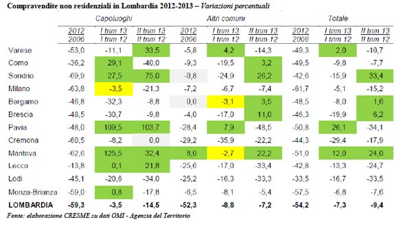 Anche nell’edilizia non residenziale le cose non vanno benissimo: in città si registra, tra il 2006 e il 2012, un -60,5% a Cremona, mentre in tutta la provincia si parla di un calo del 44,3%. Nel primo trimestre 2013, rispetto allo stesso periodo dell’anno prima, a Cremona si registra un -8,2% e un -29,4% nella Provincia. Per quanto riguarda infine il secondo trimestre, in città non vi sono state variazioni, mentre sull’intero territorio si parla di un -17,9%.
