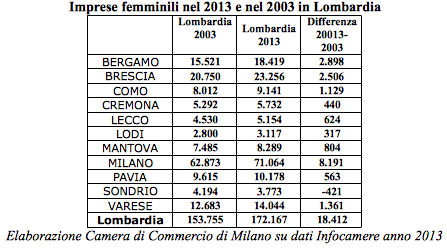 “Nel 2013 – si legge ancora – si registra un leggero calo annuale delle imprese femminili in Lombardia che passano da 173.033 imprese attive nel 2012 a 172.167 (-0,5%). Settori principali sono il commercio (quasi 46mila imprese attive), le altre attività di servizi (19.812) e le attività manifatturiere (17.996). Di rilievo anche il settore delle attività immobiliari: in regione oltre 16mila imprese su 62mila attive in Italia (il 25,9 per cento). Per numero di imprese, tra le province, dopo Milano vengono Brescia (23.256 imprese), Bergamo (18.419) Varese (14.044), Monza e Brianza (12.826) e Pavia (10.178)”.