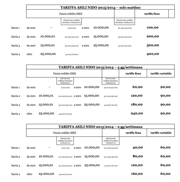 La Giunta comunale, su proposta dell’assessore alle Politiche Educative, Jane Alquati, ha stabilito di introdurre, in via sperimentale, nuove modalità di frequenza degli asili nido per il periodo aprile/luglio 2014, approvando le tariffe per questo innovativo servizio. La novità principale riguarda l’introduzione, a livello sperimentale e fino alla fine dell’anno educativo 2013/2014, di una possibilità di iscrizione all’asilo nido con una frequenza oraria diversa: solo al mattino con uscita prima del pasto; oppure solo tre giorni settimanali, con il pasto; oppure solo due giorni settimanali, sempre usufruendo del pasto di mezzogiorno. In questo modo si ritiene di poter soddisfare una fascia di famiglie che cercano un sostegno nella cura dei bambini, ma che non hanno necessità di un servizio a tempo pieno (ad esempio, genitori che lavorano su turni o con un part time verticale, o che possono appoggiarsi per alcuni giorni alla settimana a nonni o altri parenti). Questo tipo di richiesta è in aumento in tutti i paesi, e quindi il Comune ritiene di potere assecondare tale esigenza consentendo al tempo stesso un risparmio alle famiglie in una fase di difficoltà economica. Le tariffe del servizio sono naturalmente riparametrate, in base alla fascia oraria o ai giorni di frequenza richiesti. E’ la possibilità di inserire i bambini, che richiedono una frequenza differenziata, anche dopo il termine normalmente stabilito del 31 marzo.