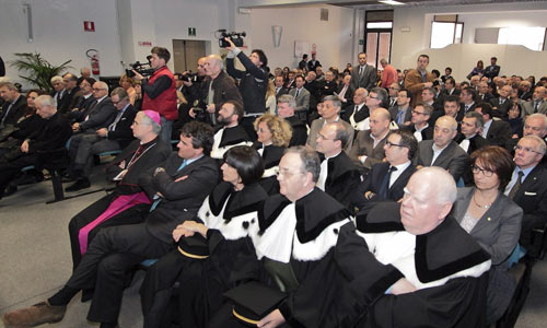 In precedenza era intervenuto il presidente della Provincia Massimiliano Salini, che aveva ribadito la necessità di un passo indietro del pubblico come fornitore di servizi a vantaggio del privato, purchè il primo sappia svolgere un ruolo forte di programmazione e controllo. Il sindaco Oreste Perri si era rivolto in particolare alla platea di giovani che affollava una buona metà dell’aula magna della Cattolica, coniugando il messaggio dell’impegno e del sacrificio personale con quello della soldiarietà verso chi sta più indietro.