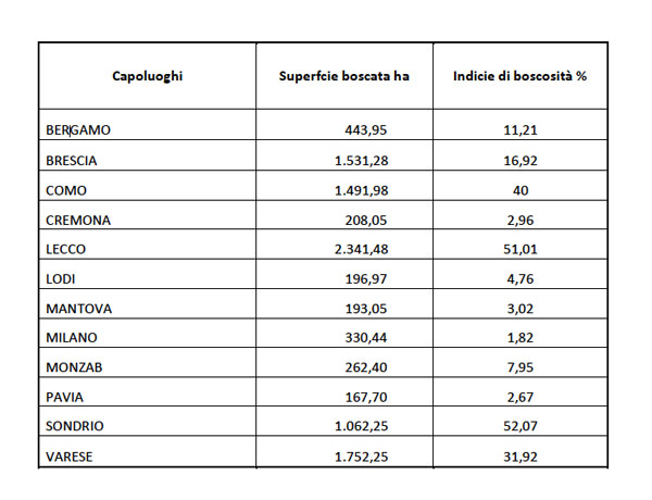 L’indice di boscosità media delle foreste urbane in pianura è pari al 5,60%, con sette province che stanno al di sotto di tale valore (Bergamo, Brescia, Cremona, Lodi, Mantova, Pavia), Milano è simile (5,8%), le altre al di sopra, fino al 24,28% di Varese e al 25,57% di Como.