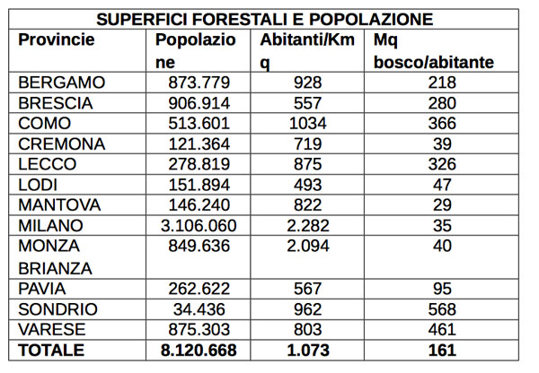 Secondo il rapporto, la presenza delle foreste urbane all’interno dei comuni lombardi non è affatto adeguata rispetto alle necessità di equilibrio ecologico del territorio, di qualità della vita di chi lo abita e del benessere delle popolazioni, soprattutto nelle aree di pianura. Sono 714 i comuni urbani lombardi oggetto del primo inventario delle foreste urbane della Lombardia, il 46,24 % dei comuni delle dodici province lombarde con una popolazione di 8.120.668 abitanti, oltre l’80 % dell’intera popolazione regionale. In media ogni cittadino lombardo dei comuni urbani ha a disposizione 161 mq di bosco urbano (circa la metà di un campo da tennis).