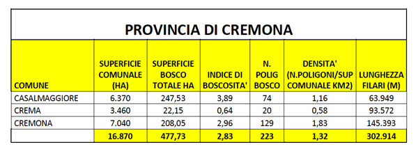 La provincia più virtuosa in questo senso è quella di Varese con il 30,92% delle foreste urbane, in 130 comuni, mentre fanalino di coda è appunto Cremona. Le provincie lombarde con maggior quantità di bosco urbano per abitante sono Sondrio con 568 metri quadrati per abitante, Varese con 461 metri quadrati per abitante e Como con 366 metri quadrati per abitante. Seguono nell’ordine Brescia, Bergamo, Pavia, Lodi, Monza Brianza, Cremona (2,6%), Milano e ultima Mantova con solo 29 metri quadrati di bosco urbano per abitante.