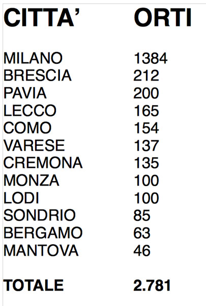 A livello regionale, sfiorano quota 2.800 gli orti urbani nei capoluoghi di provincia della Lombardia, con una crescita del 40% rispetto a due anni fa. E’ quanto spiega la prima Mappa 2014 stilata dalla Coldiretti Lombardia sulle oasi verdi coltivate a gestione pubblica, più alcune nate dall’iniziativa dei privati fra Milano, Lodi, Bergamo, Brescia, Cremona, Mantova, Como, Lecco, Varese, Sondrio, Monza e Pavia.