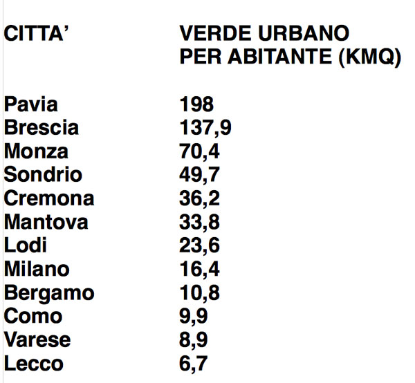 A livello regionale, secondo gli ultimi dati Istat, il verde urbano è di circa 36 metri quadrati per abitante, con valori pro capite molto diversi a seconda dei capoluoghi di provincia: 8,9 a Varese, 9,9 a Como, 49,7 a Sondrio, 16,4 a Milano, 10,8 a Bergamo, 137,9 a Brescia, 198 a Pavia, 36,2 a Cremona, 33,8 a Mantova, 6,7 a Lecco, 23,6 a Lodi e 70,4 a Monza.