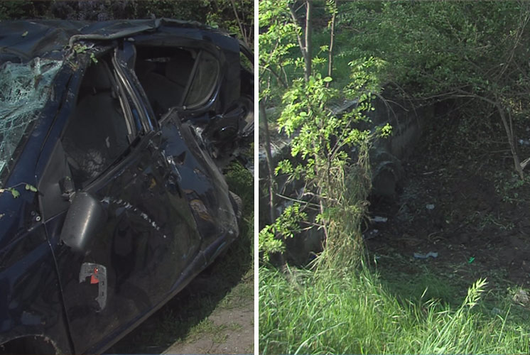 Sopra e sotto, Valentina con i suoi cani e l’auto recuperata dal fosso dopo l’incidente