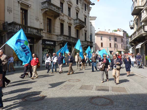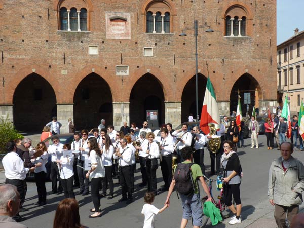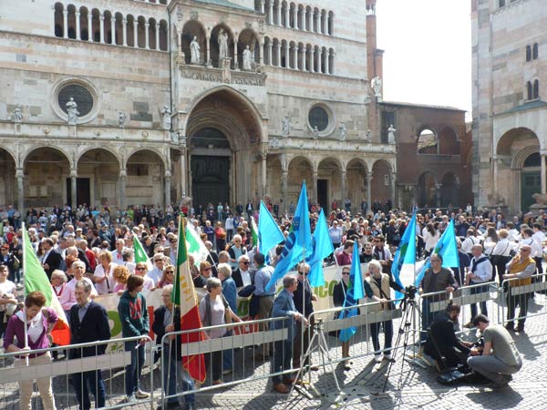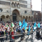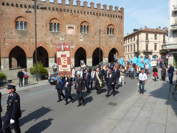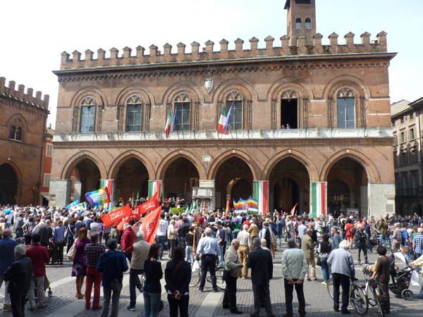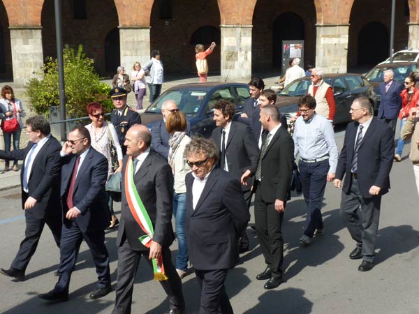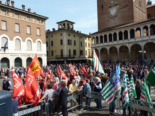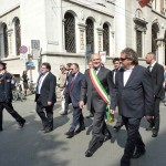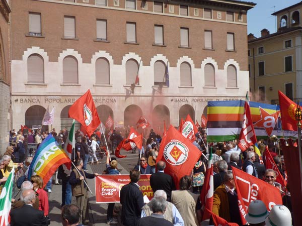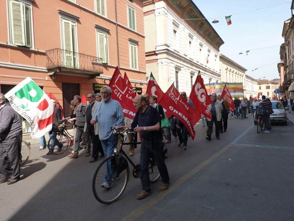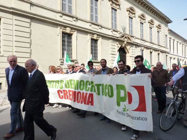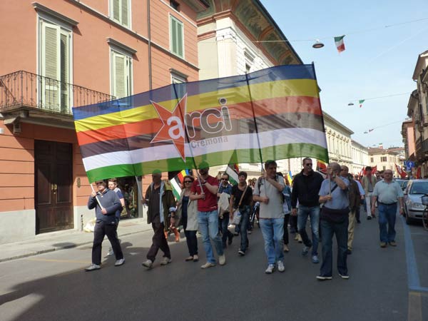 AGGIORNAMENTO – Grande assembramento nella piazzetta di fronte a San Luca per la partenza del corteo del 69º anniversario della Liberazione dell’Italia dal fascismo. Alle 10.30, sulle note di Bella Ciao, è partito il lungo corteo che si è snodato lungo corso Garibaldi, corso Campi, fino a piazza Stradivari, per poi approdare in piazza del Comune. In testa al corteo aprivano le autorità cittadine, tra cui il sindaco Oreste Perri, gli assessori Francesco Zanibelli, Claudio Demicheli, Francesco Bordi, Maria Vittoria Ceraso. Presenti in prima fila anche il parlamentare Luciano Pizzetti e il consigliere regionale Carlo Malvezzi.