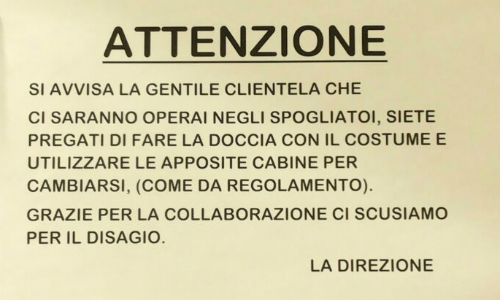 Un biglietto da visita desolante per chi fruisce dell’impianto comunale, che non ha mancato di suscitare commenti tra l’ironico e lo scandalizzato da parte dei frequentatori. Molti i commenti (divertiti ma non solo) anche di fronte al cartello affisso davanti agli spogliatoi femminili: attenzione, operai al lavoro, fate la doccia con il costume.