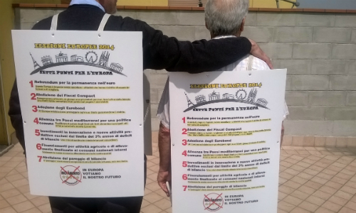 Curiosità della campagna elettorale. C’è chi punta sul cuore, come Forza Italia che domani pomeriggio (domenica 11 maggio) offrirà un fiore alle mamme e un gelato ai bambini in piazza Stradivari; c’è chi sperimenta il gazebo all’ingresso del cimitero (l’assessore Demicheli); e chi invece recupera uno dei più antichi sistemi di propaganda elettorale, quello dell’uomo sandwich. In barba alla comunicazione politica via Internet, di cui i grillini sono stati antesignani, Elia Sciacca e Gabriele Beccari, i due portavoce del movimento cremonese, stanno battendo le strade della città, centro e periferie comprese, con addosso i cartelloni che reclamizzano i punti fondamentali del loro programma elettorale. Giocando con l’alfabeto delle cinque S: “Per una Cremona più Semplice, Sicura, Solidale, Sorridente, Sostenibile”. Sul retro, l’invito a mettere la X sul simbolo del movimento anche sulle schede delle Europee. Al primo punto, il referendum sulla permanenza nell’euro. Sabato 10 maggio alle 18, illustrazione del programma elettorale a SpazioComune.