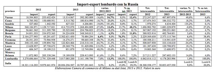 A livello lombardo, infatti, l’export è cresciuto del 12,4%. Supera i 3,1 miliardi di euro e rappresenta il 29,3% del totale italiano. E per incremento delle esportazioni regionali nell’ultimo anno la Russia è il secondo Paese europeo: viene infatti dopo la Bulgaria (prima con +17,1%) e precede Paesi Bassi (+9,1%) e Regno Unito (+7,7%).Questi i dati che emergono dall’elaborazione della Camera di Commercio di Milano su dati Istat.