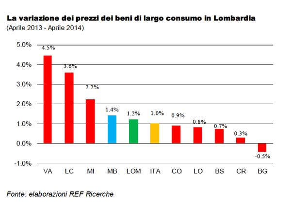 Nelle altre province lombarde Bergamo è la città più economica della Lombardia per il carrello della spesa (-6,7% rispetto alla media lombarda), seguono Como, Mantova, Cremona e Lodi. Milano e Varese le più care (rispettivamente +8,5% e +8,4% rispetto alla media regionale). Nell’ultimo anno, i prezzi degli alimentari crescono di più a Varese (+4,5%) e a Lecco (+3,6%), leggermente sopra la media lombarda anche Milano (+2,2%) e Monza (+1,4%). Bergamo è l’unica città in cui diminuiscono i prezzi (-0,5%).
