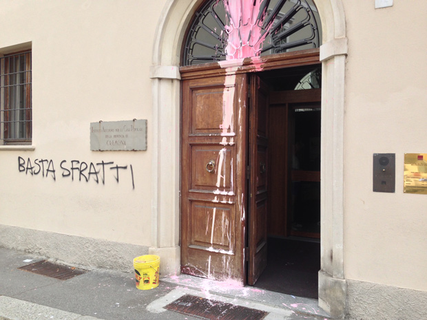 Scritte e vernice sui muri dell'Aler contro gli sfratti
