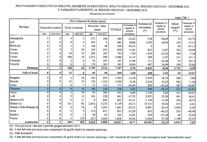 Analizzando ancora la situazione in provincia nel 2013, scopriamo che ci sono state 596 richieste di esecuzione, mentre sono stati 213 gli sfratti già eseguiti (in calo). Per quanto riguarda la ragione degli sfratti si riscontra che ben 534 hanno riguardato cause di morosità e solo 24 casi hanno riguardato la finita locazione.