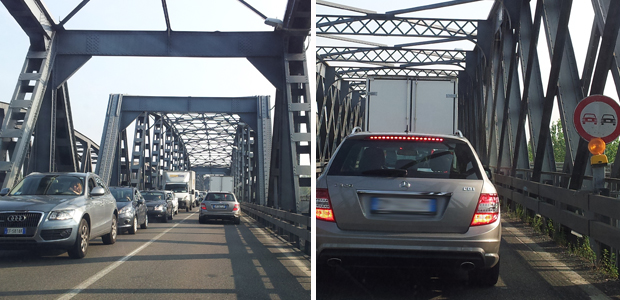 “E’ stata firmata l’ordinanza della Provincia di Piacenza relativa al divieto di transito, – a partire dal 14 luglio 2014 fino al 13 settembre 2015 (ma con possibilità di proroga) – sul ponte sul Po a Castelvetro (lungo la strada provinciale 10 R “Padana Inferiore”) per gli autoveicoli aventi massa a pieno carico superiore a 20 tonnellate. Potranno quindi transitare sull’infrastruttura solo le autovetture e i bus di linea. Rispetto al precedente provvedimento, entrato in vigore nel 2012, sarà quindi interdetta la circolazione anche ai mezzi vuoti con massa a pieno carico superiore a venti tonnellate”. Ad annunciarlo è stato il presidente della Provincia di Piacenza Massimo Trespidi, che ha spiegato come il provvedimento si sia reso necessario a causa delle condizioni del ponte. “Costruita nel 1890 – ha spiegato – la struttura fu bombardata durante la seconda guerra mondiale, tanto che sei campate su dodici (sul lato cremonese) furono completamente distrutte e poi ricostruite nell’anno 1946. Il ponte viene oggi percorso giornalmente da un notevole volume di traffico veicolare con un traffico giornaliero medio di oltre 22mila veicoli con punte sino a 24mila”. Nel corso degli anni, come ha spiegato ancora il presidente Trespidi, il ponte ha subito, a cura dell’Anas, allora ente proprietario della arteria, a causa del progressivo aumento del traffico veicolare abbinato alla vetustà del manufatto, una serie di interventi di adeguamento e di ripristini, anche a seguito di gravi incidenti stradali. In particolare si ricorda quello del 1995 dove la quarta campata (lato Piacenza) è stata interessata da un violento incendio causato da un’autocisterna. Gli ultimi consistenti interventi sono stati effettuati, a cura della Provincia di Piacenza, nuovo ente proprietario, nel 2004 e 2005 dopo che era stata effettuata una accurata analisi dello stato di deterioramento del ponte nel 2002.