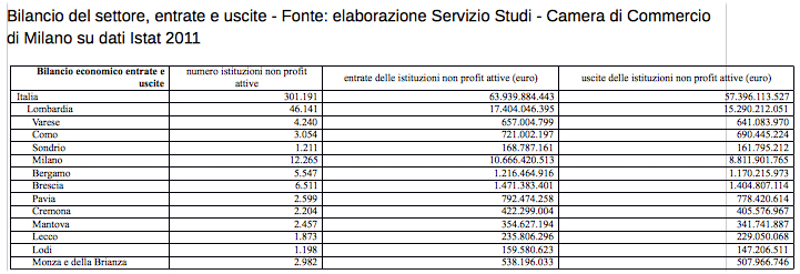 Per il mondo del non profit bilancio complessivamente positivo in provincia. Un’elaborazione su questo panorama, a livello regionale, è stata realizzata dalla Camera di commercio di Milano. Nel nostro territorio si parla di oltre 6500 addetti e più di 36mila volontari. Quasi “814mila volontari nel no profit in Lombardia: sono 46mila le imprese in regione secondo un’elaborazione del servizio studi della Camera di commercio su dati Istat al 2011 e danno oltre 200mila impieghi, tra 166mila posti di lavoro diretti, altri 54mila lavoratori esterni, oltre a circa 1.600 temporanei”, si legge nello studio, che ha preso in considerazione i dati 2011 per la loro completezza. “La Lombardia – si legge ancora – conta nel no profit circa un addetto su quattro in Italia e un volontario su cinque. Primi settori servizi per lo sport, il tempo libero e l’intrattenimento con 22mila imprese, altri servizi, tra cui quelli alla persona con 14mila e sanità-assistenza con oltre 6mila”. In provincia di Cremona lo studio parla di 2204 imprese, con 6569 addetti, oltre a 1410 lavoratori esterni e 60 lavoratori temporanei. I volontari conteggiati: 6158. Entrate, complessivamente, per 422.299.004 euro e uscite per 405.576.967 euro in un anno.