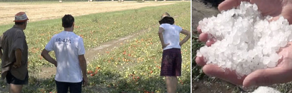 Secondo l’analisi effettuata da Coldiretti, nel Cremonese sono stati “quindici minuti d’inferno tra la una e le due di questa notte con le schegge di ghiaccio scagliate con grande intensità sui campi della zona. A rischio l’intera produzione di pomodoro: secondo i primi riscontri – spiegano i tecnici della Coldiretti – i danni all’oro rosso superano il 90 per cento. La violenza della grandine non ha risparmiato nemmeno i pomodori più acerbi. Il problema ora – continua la Coldiretti – non è solo di reddito per le aziende, ma anche di occupazione: con un danno così, il periodo di raccolta che avrebbe dovuto iniziare tra una decina di giorni è stato completamente compresso. Quest’anno i lavoratori stagionali nei campi saranno di meno”. A Rivarolo del Re nell’azienda agricola Banderini Emanuela la grandine ha distrutto l’80 per cento della produzione di frutta stagionale, dalle pesche alle albicocche. “E’ stata una cosa del tutto improvvisa – spiegano i titolari dell’azienda – Di solito, quando le previsioni danno rischio grandine aumentiamo il ritmo di raccolta per salvare quanto più prodotto possibile. Questa volta, invece, dal meteo non sono arrivati segnali preoccupanti e così ora ci ritroviamo quasi senza frutta da vendere nei mercati di Campagna Amica”.