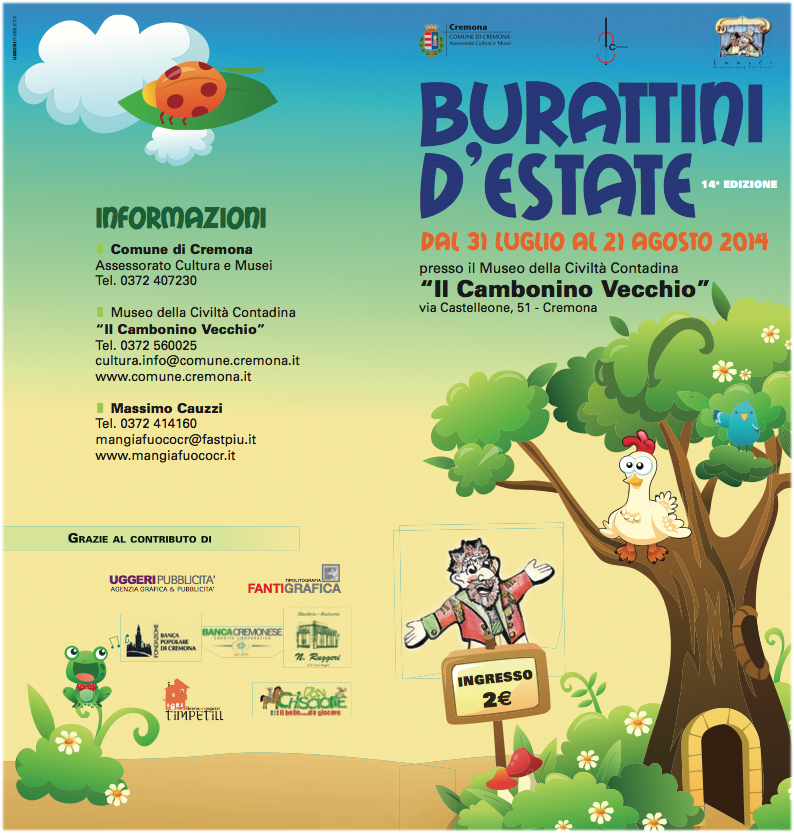 Torna la rassegna Burattini d’Estate. Quattro spettacoli in programma il giovedì sera, a partire dal 31 luglio, con appuntamenti collaterali di stampo culturale e gastronomico. “Si rinnova l’appuntamento con la rassegna Burattini d’Estate, proposta dall’Associazione Culturale EmmeCi di Massimo Cauzzi, in collaborazione con il Comune di Cremona, Settore Cultura e Musei – spiega una nota diramata da Palazzo comunale -. Giunta alla XIV edizione, la rassegna si tiene negli spazi del Museo della Civiltà Contadina il Cambonino Vecchio, occasione questa per valorizzare e promuovere il patrimonio della collezione museale offrendo momenti di socializzazione per le famiglie, riproponendo loro un’arte di spettacolo che tempo addietro si svolgeva proprio in questi in questi luoghi, le aie delle cascine”.