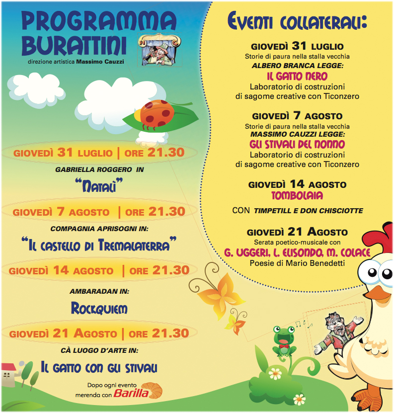 “Come per le passate edizioni, compagnie teatrali di livello nazionale porteranno spettacoli rappresentati con le varie tecniche del teatro di figura – sottolinea la nota del Comune -: burattini a guanto, pupazzi, ombre e marionette. Gli spettacoli in cartellone si avvicinano alla struttura narrativa della fiaba per favorire favorire il coinvolgimento dei bambini. Sono in programma quattro spettacoli il giovedì sera, a partire dal 31 luglio. Le rappresentazioni saranno accompagnate da appuntamenti collaterali di carattere culturale e gastronomico. In caso di pioggia gli spettacoli si terranno al Centro Culturale S. Maria della Pietà oppure a Palazzo Cittanova. L’ingresso è a pagamento, con cifra simbolica di 2 euro”.