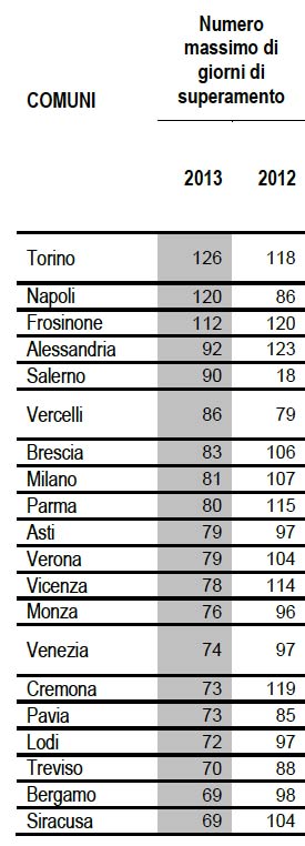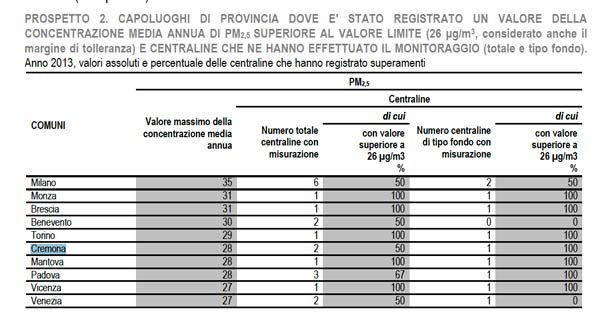 Il rapporto evidenzia però anche i dati sulle polveri sottili. Se infatti la nostra città è ben posizionata per il verde urbano, è purtroppo ai primi posti (6º) anche per il superamento della concentrazione media annua delle Pm10, che è pari a 28 microgrammi per metro cubo (mentre il valore limite è 26). Come se non bastasse, Cremona conquista anche un 14º posto per numero di giorni di superamento della soglia di attenzione (73 giorni).