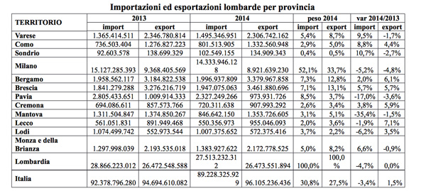 Il dato emerge da un’elaborazione dell’ufficio Studi della Camera di commercio di Milano su dati Istat al primo trimestre 2014 e 2013. Moltissimi sono i settori in cui si internazionalizza: dalla società che organizza eventi a quella che realizza prodotti innovativi per la casa e il giardino, dall’azienda che crea sistemi di isolamento termico che uniscono design ed efficienza energetica al salumificio che produce con tecniche ecompatibili, dal produttore di cancelli automatici e porte scorrevoli al negozio che vende online t-shirt ispirate alla storia dell’aviazione realizzate in collaborazione con artisti e designers. Nell’export la Lombardia è il nodo centrale delle relazioni commerciali italiane con il 27% del totale nazionale per un valore che nei primi tre mesi del 2014 ha superato i 26 milioni di euro, stabile rispetto all’anno precedente. Milano, Brescia e Bergamo le prime province esportatrici. E se i macchinari rappresentano la prima voce dell’export lombardo con circa un quinto del totale, Varese è specializzata in mezzi di trasporto (19,9%), Como in tessile (28,2%), Milano in macchinari (18,5%) e abbigliamento (13,9%), Lodi in computer e apparecchi elettronici (35,9%), Bergamo in macchinari (24,8%) mentre i metalli e prodotti in metallo prevalgono per Sondrio (34,3%), Brescia (36,6%), Cremona (41,8%), Mantova (19,2%), Lecco (38,3%) e Monza e Brianza (23,9%).