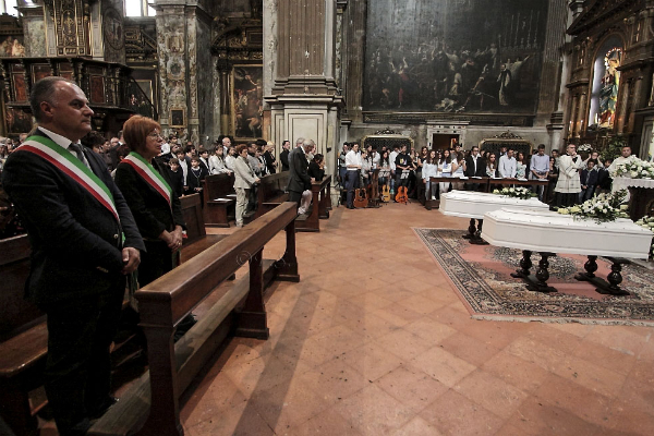 Un ricordo commosso e parole di conforto alla mamma sono giunte anche da Mons. Attilio Arcagni, il precedente parroco di San Pietro che aveva battezzato i due bambini. Matteo, in particolare, che aveva appena fatto la cresima, era molto presente nella vita dell’oratorio. A ricordarlo, oltre ai cuginetti e agli zii, c’erano moltissimi giovani in chiesa: i suoi compagni della quinta A della scuola Capra Plasio, dove Matteo era uno dei migliori, aperto al mondo, curioso, affettuoso e appassionato; le insegnanti, in particolare Gigliola Generali e Silvia Mondani che lo hanno accompagnato e visto crescere in questi ultimi cinque anni. C’era un folto gruppo di ragazzi del Grest di Bassano con le loro magliette colorate e la squadra di nuoto della Baldesio, nella quale l’undicenne militava. C’erano le suore del Sacro Cuore di Gesù, dove la piccola Greta frequentava la scuola materna. In rappresentanza delle istituzioni, il vicesindaco Maura Ruggeri che ha portato il cordoglio della comunità cremonese “per una tragedia troppo grande per la famiglia, ma che colpisce tutti”; e il sindaco di Bassano, Gianpaolo Seniga.