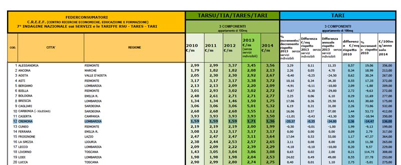 Un dato, quello cremonese, che va in controtendenza rispetto al trend nazionale: secondo i ricercatori, “nel campione delle 40 città in cui è stata varata la Tari 2014, l’aumento medio nel quadriennio 2010-14 è stato infatti del 19,9%, pari a +45 euro (senza considerare nella Tares la componenti servizi indivisibili), a fronte di un’inflazione nazionale nello stesso lasso di tempo dell’8,6% (dato Istat)”. In particolare, l’incremento rilevato è stato del 160% a Reggio Emilia, del 114% a Livorno e del 100,5% Sanluri. Al contrario risultano invece in calo gli importi a Cremona (-14%), a Verbania (-13%) e Caserta (-11%). Osservando i risultati di un solo anno, si nota che l’aumento più rilevante è quello di Sanluri, dove la spesa lievita in un solo anno di 1 euro al metro quadro, raddoppiando quindi l’importo annuo (+110,5%). A seguire troviamo Lodi con il +24%, Frosinone e Brescia con il +17%. All’opposto, invece, si registra una diminuzione del -20% a Cremona, del -17% a Macerata, del -13% a Sondrio, del -11% a Caserta e del -10% Mantova.