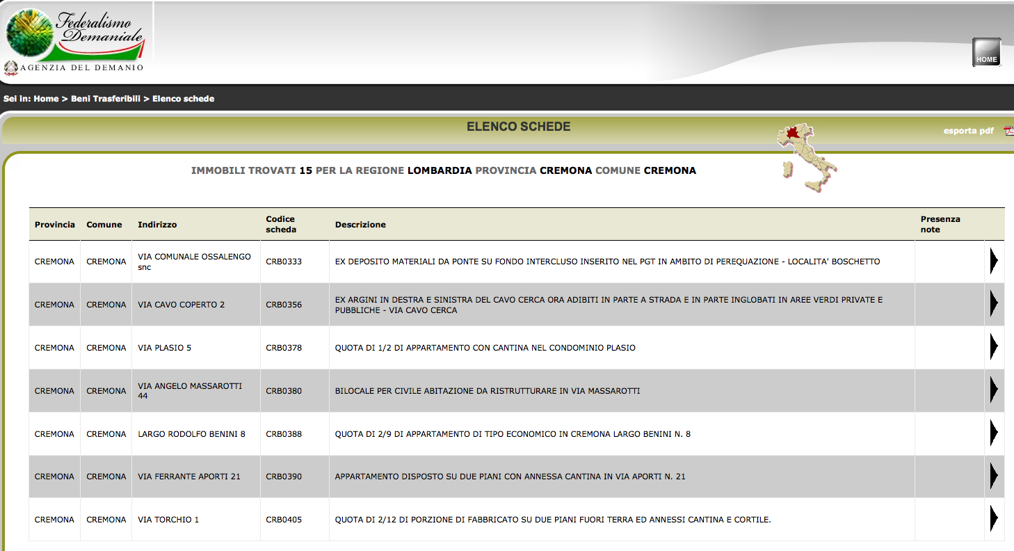 Questo comunque l’elenco dei beni trasferibili al Comune di Cremona pubblicato sul sito dell’Agenzia: