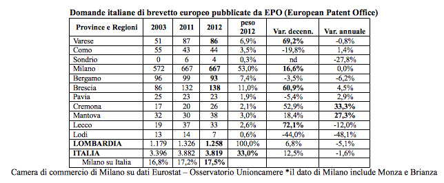 “Parte dalla Lombardia – si legge nella sintesi dell’elaborazione – un terzo dei brevetti europei che viene depositato dall’Italia: nel 2012 sono stati 1.258 su 3.819. La provincia di Milano che in Europa è settima per numero di brevetti depositati dopo città come Monaco, Berlino e Parigi, da sola pesa il 17,5% del totale italiano con 667 brevetti. In pratica un brevetto europeo che arriva dall’Italia su sei è milanese”. “Dopo Milano – si legge ancora -, in Lombardia vengono le province di Brescia (138), Bergamo (93) e Varese (86). E se rispetto al 2011 il dato medio lombardo e italiano sono in flessione, Milano resta stabile mentre crescono soprattutto le province di Cremona (+33,3%) e Mantova (+27,3%). Se si considera il trend di crescita decennale, sono Lecco (+72,1%), Varese (+69,2%) e Brescia (+60,9%) le province che crescono di più”. Subito dopo c’è la provincia cremonese con il suo +52,9%.
