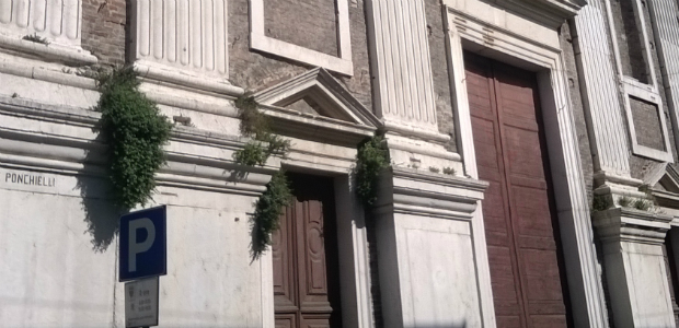 Crescono le piante infestanti tra marmi e stucchi della facciata di San Marcellino