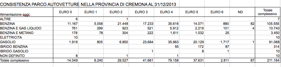 In provincia di Cremona sono 11.167 le vetture benzina euro 0 iscritte al pubblico registro automobilistico, una bella fetta delle 105.555 auto (a benzina) che risultano (al 31 dicembre 2013) nella banca dati nazionale dell’Aci (vedi tabella in basso). Numeri che evidenziano comunque un discreto rinnovamento del parco mezzi circolanti, con ben 35.616 autovetture a benzina euro4. Sono invece 1.919 le auto diesel euro0 immatricolate in provincia; 805 i diesel euro 1 e 6.850 i diesel euro 2. Il parco automezzi alimentati a gasolio mostra anch’esso ampi segnali di rinnovamento, con una netta prevalenza di euro 3, 4 e 5, su un totale di 91.068 registrati. Complessivamente, i veicoli immatricolati in provincia e tuttora circolanti di più vecchia concezione, quindi più inquinanti e off-limits, ammontano a 20.741. su un totale di 211.000.