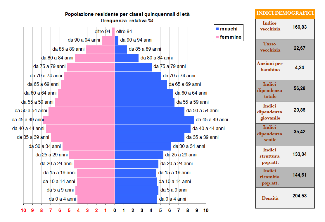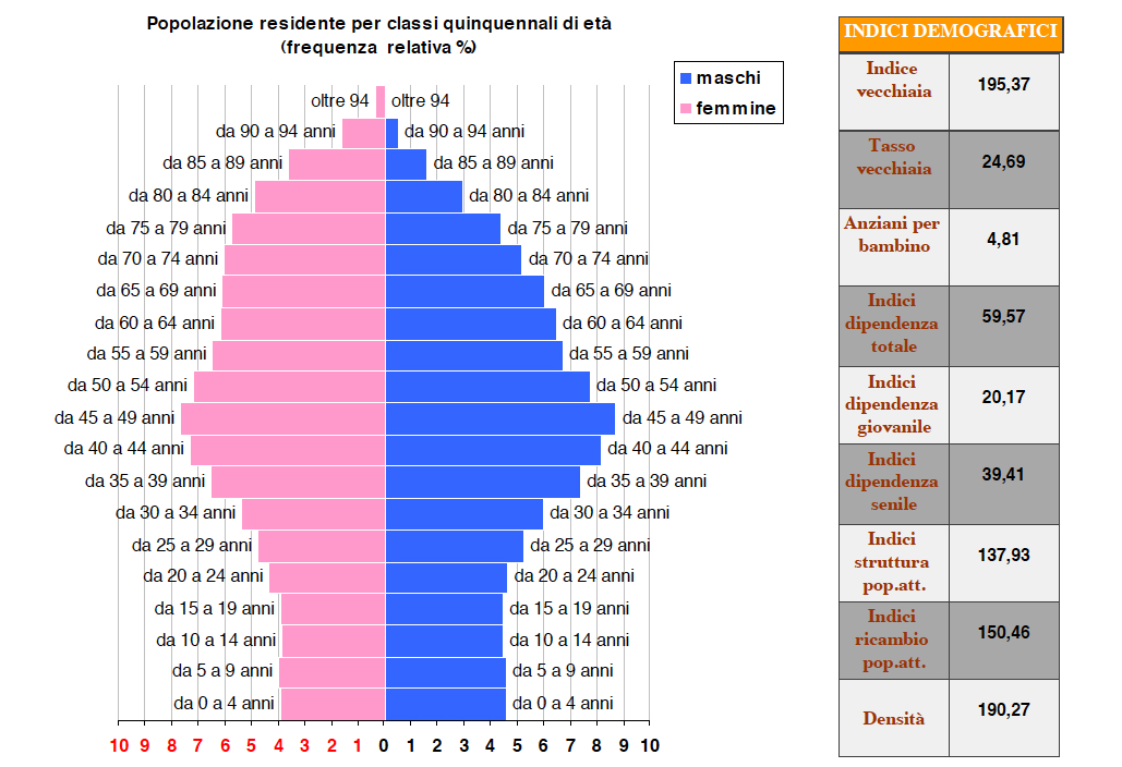 L’Indice di Struttura della popolazione attiva (IS) è il rapporto percentuale tra la popolazione di età compresa tra i 40 e i 64 anni a quella tra i 15 e i 39 anni. Nelle popolazioni stabili o in crescita questo indice è inferiore al 100%, mentre nelle popolazioni tendenzialmente e fortemente in calo il rapporto supera il 100%. A livello provinciale l’indice è pari a 133, ovvero, per ogni 100 persone di età compresa tra 15 e 39 anni ve ne sono 133 di età compresa tra 40 e 64 anni. Solo segnali sconfortanti quelli che emergono dal rapporto statistico provinciale che impongono agli amministratori locali scelte precise per frenare emorragia dei (pochi) giovani che nascono e frequentano le scuole in città, salvo poi il più delle volte scappare via alla ricerca di opportunità lavorative.