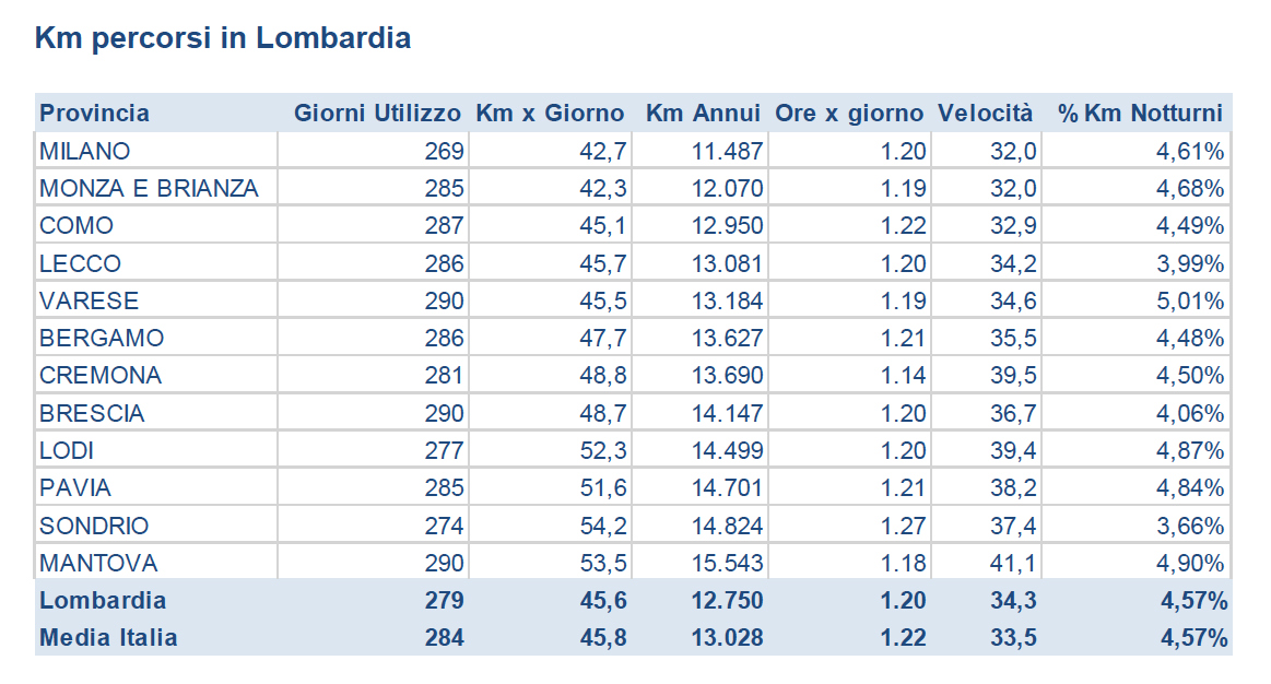 Tornando ai dati delle scatole nere lombarde, emerge che i lombardi trascorrono 1 ora e 20 minuti al giorno al volante, guidando a una velocità media di 34,3 km/h, rispetto a una media nazionale di 33,5 km/h. Si percorrono 12.750 km annui, dato inferiore rispetto alla media nazionale di 13.028 km, ma influenzato dal basso tasso di utilizzo dell’auto nelle province di Milano e Monza-Brianza. In media in Lombardia l’auto viene utilizzata per 279 giorni l’anno con una percorrenza media di 45 km, rispetto a una media nazionale di 284 giorni e una percorrenza media di 45 km giornalieri. Cremona si mostra sopra la media regionale un po’ per tutti i parametri analizzati, ma si distingue dalle altre province in maniera significativa solo per il dato sulla velocità. Ad esempio, i cremonesi utilizzano l’auto 281 giorni all’anno; percorrono 48,8 km al giorno e 13.690 km all’anno; guidano per 1h14m al giorno, con un’incidenza delle ore notturne del 4,5%.