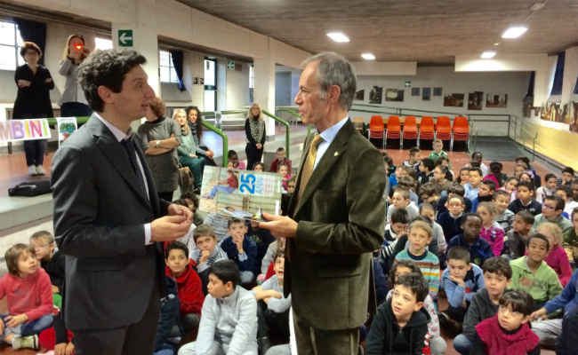 Una volta giunti a scuola, alle 08:30, Giancarlo Potenza, in qualità di Presidente del Comitato provinciale di Cremona dell’UNICEF, ha consegnato al Sindaco il rapporto UNICEF che viene redatto ogni anno in occasione dell’anniversario della sottoscrizione della Convenzione ONU.
