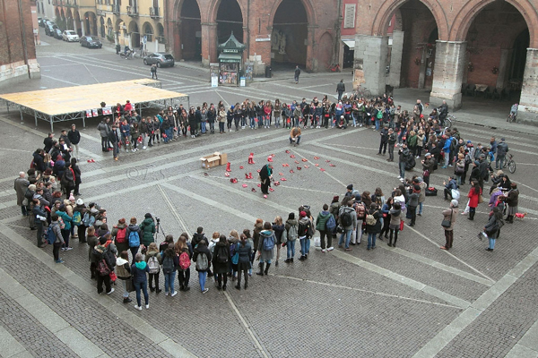 L’artista, insieme agli studenti delle scuole superiori di Cremona, che con entusiasmo hanno partecipato all’iniziativa, ha colorato la grigia piazza con le sue scarpe rosse: ogni scarpa rappresenta una donna uccisa. Per ogni paio di scarpe posizionato dagli studenti, veniva letto il nome di una donna. “La mia idea è nata nel 2009, per puntare il dito contro il silenzio che avvolce l’uccisione di centinaia di donne a Ciudad Juarez – spiega l’artista -. Da lì ho pensato di ricordare tutte le donne vittime di violenza nel mondo”.
