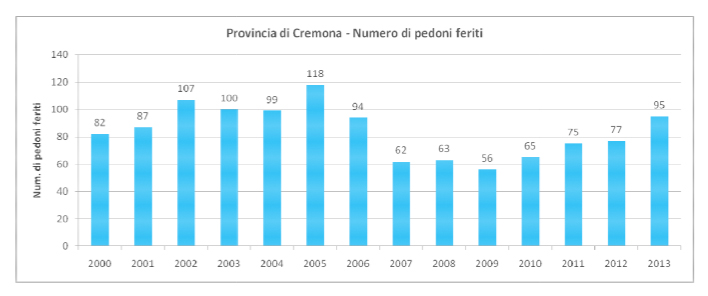 Nella categoria pedoni il dossier, a differenza delle altre categorie, contiene anche i dati relativi ai feriti. Numeri preoccupanti: dal 2009 in costante crescita la quantità di pedoni con lesioni dovute a incidenti. Nel 2013 il conteggio è di 95 unità, dato maggiore rispetto a quelli di 2000 e 2001 e non lontano dai picchi di 2002 e 2005, anni, questi ultimi, caratterizzati da oltre 100 pedoni feriti.