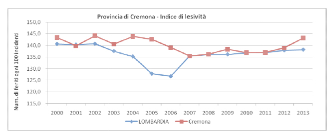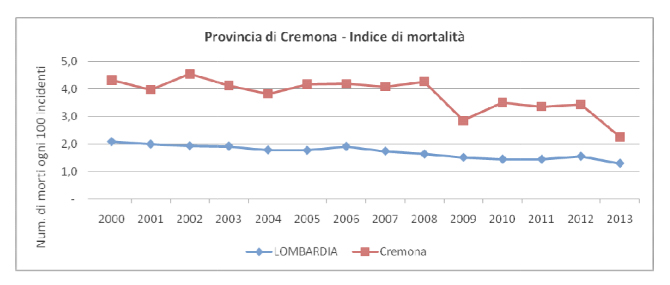 Indici di mortalità e lesività ancora sopra la media regionale nel territorio cremonese: “Considerando i principali indici di incidentalità, ossia quelli di mortalità e di lesività, si può osservare che nel 2013 e nell’intero periodo 2000-2013, tali indici presentano valori più alti rispetto a quelli regionali. L’indice di mortalità per l’anno 2013 (numero di morti ogni 100 incidenti) per la provincia di Cremona, si attesta ad un valore di 2,26 che risulta superiore all’andamento dell’indice di mortalità regionale, ma inferiore al valore provinciale nell’anno 2000 (pari al 4,33). L’indice di lesività (numero di feriti ogni 100 incidenti), per la provincia di Cremona, si mantiene superiore all’andamento dell’indice di lesività regionale tranne per gli anni 2007 e 2010 i nei quali il valore si allinea al dato regionale. Per l’anno 2013 esso è pari a 143,2 ed è un valore leggermente inferiore rispetto al dato iniziale del 2000 (143,4)”.