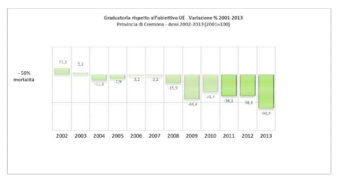 “Il programma europeo di azione per la sicurezza stradale promosso dall’Assemblea generale delle Nazioni unite e dalla Commissione europea, attraverso il Libro bianco del 2001 prevede, per la nuova decade 2011-2020, un ulteriore dimezzamento del numero dei morti sulle strade in Europa e nel mondo entro il 2020 e una riduzione dei feriti gravi”, ricorda il dossier. Nel territorio cremonese tra 2001 e 2013 morti diminuiti del 60,30%: “In provincia di Cremona, il dato relativo alla variazione percentuale del numero dei morti, osservata a partire dal 2001 (anno di avvio della risoluzione comunitaria per perseguire il dimezzamento della mortalità per incidente stradale) conferma che il raggiungimento del risultato prefissato è stato ottenuto nell’anno 2013 con una variazione pari al 60,30%”.