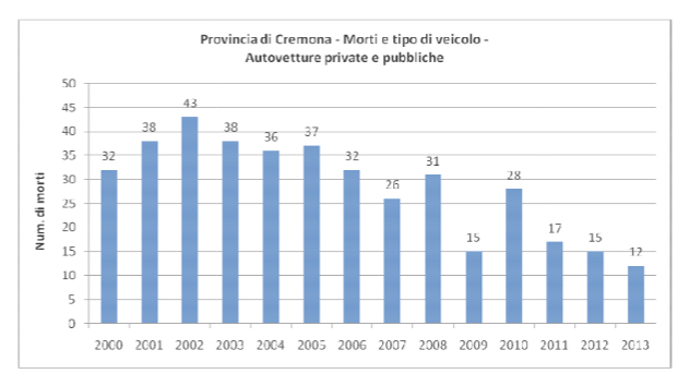 Dodici decessi in auto: “Nell’analisi dei valori di mortalità relativi agli occupanti delle autovetture, si può notare come, nel corso del 2013, in provincia di Cremona vi siano stati 12 morti associati a questa tipologia di veicolo. Se si analizza il dato a partire dall’anno 2000, si può notare a partire dal 2006 una diminuzione del valore (nonostante alcuni picchi nel 2008 e nel 2010) anche se, sia a livello provinciale che regionale, le autovetture si confermano la categoria di veicoli i cui occupanti, risultano maggiormente coinvolti in incidenti stradali mortali”.