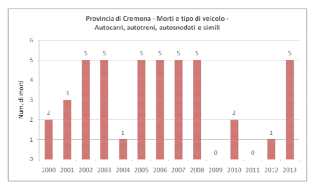 Cinque, invece, i decessi in mezzi pesantI: “Nell’analisi dei valori di mortalità relativi agli occupanti dei mezzi pesanti (autocarri, autotreni, autosnodati e simili), si può notare come, nel corso del 2013, in provincia di Cremona vi sia stati 5 morti associati a questa tipologia di veicolo. Se si analizza il dato a partire dall’anno 2000, si può notare che, a fronte di un valore unitario nel 2004, si ha un andamento costante per ben 4 anni consecutivi (il numero di occupanti dei mezzi pesanti deceduti è per il 2005, il 2006, il 2007 ed il 2008 pari a 5) e si ha, nei successivi anni una diminuzione del numero di decessi per tale categoria, fino al 2013 quando, come sopracitato, il valore torna ad attestarsi a 5 morti”.