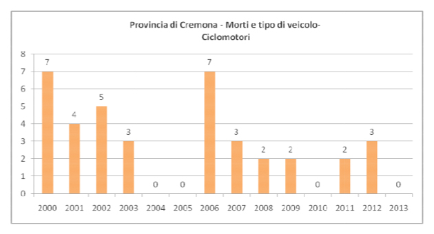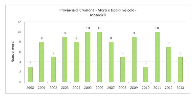 Cinque decessi anche tra conducenti di motocicli: “Nell’analisi dei valori di mortalità relativi ai motocicli, si può notare come, nel corso del 2013, in provincia di Cremona vi siano stati 5 morti riferiti a questa tipologia di veicolo. Se si analizza il dato a partire dall’anno 2000, si può notare un andamento variabile del valore”.