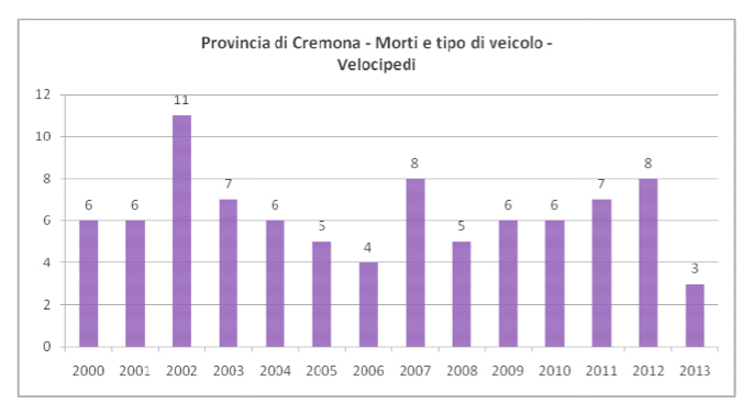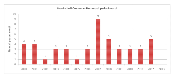 Nessun decesso per quanto riguarda i ciclomotori e i pedoni, mentre si conteggiano tre morti nella categoria velocipedi: “Nell’analisi dei valori di mortalità relativi ai ciclomotori, si può notare come, nel corso del 2013, in provincia di Cremona, non vi siano morti riferiti a questa tipologia di veicolo. Se si analizza il dato a partire dall’anno 2000, si può notare un andamento variabile nel tempo”; “nell’analisi dei valori di mortalità relativi ai velocipedi, si può notare come, nel corso del 2013, in provincia di Cremona vi siano stati 3 morti riferiti a questa tipologia di veicolo ed il valore sia il più basso, in termini assoluti nel periodo di riferimento a fronte di una crescita dei decessi a partire dal 2008 fino al 2012”; “nel corso del 2013, non vi sono pedoni deceduti in provincia di Cremona. Come si evince dalla lettura del grafico, la mortalità fra i pedoni ha raggiunto un picco nel 2007, attestandosi ad un valore di 9 vittime”.