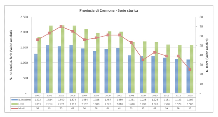 Ecco il dossier annuale completo di Regione Lombardia sugli incidenti stradali con lesioni a persone e decessi in provincia di Cremona: l’elaborazione, raccolta in un rapporto concluso questo mese, mette insieme i dati di tutto il 2013 ed evidenzia che rispetto all’anno prima “nell’anno 2013 vi è una diminuzione sia del numero di incidenti stradali (26 incidenti in meno) che del numero di morti (14 morti in meno) mentre il numero dei feriti si incrementa di 11 unità”. Considerando i numeri dal 2000 al 2013 “in valore assoluto si è passati da 1.292 incidenti nel 2000 a 1.107 incidenti nel 2013, da 56 a 25 morti e infine da 1.853 a 1.585 feriti”.