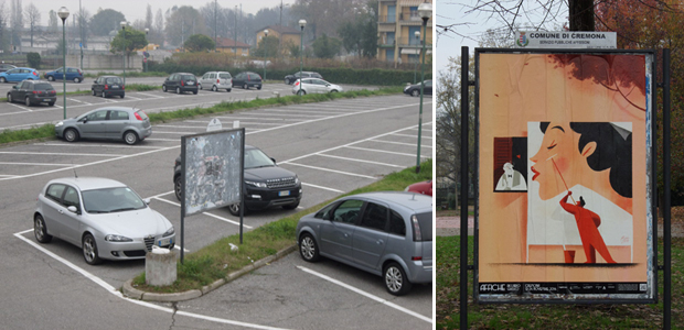 Insomma, alla fine il turista si trova costretto ad abbandonare l’idea della bicicletta. “Un po’ stordito dal dialogo surreale, esco dall’ufficio e mi ricordo di aver letto che comunque (quasi) tutte le opere sono visibili presso la galleria Tapirulan, che ha organizzato la mostra – si legge ancora sul blog -. In un quarto d’ora sono nei pressi di Piazza della Libertà, dove continuano ad affluire a centinaia i pensionati che scendono dai pullman affluiti in città per la Festa del Torrone. Trovo Tapirulan…ed è chiuso. Chiuso la domenica. Sempre”. Insomma, l’unica alternativa, per non aver fatto un viaggio inutilmente, resta quella di visitare la mostra a piedi, almeno in parte, per poi magari proseguire in auto. “E così mi incammino lungo il Foro Boario, e svolto in Via dell’Annona. E sul tabellone numero 1 finalmente c’è… la pubblicità di un’azienda energetica”. Sempre più allibito ma non scoraggiato, il giovane va avanti. In via Esilde Soldi dovrebbe esserci la seconda affiche… invece si trova di nuovo una pubblicità, sempre della stessa azienda energetica.