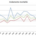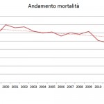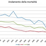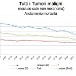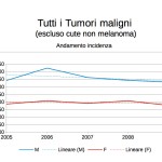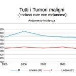 L’incidenza dei tumori in generale è decrescente tra 2005 e 2009, ma più per gli uomini che per le donne; la mortalità decresce anch’essa ma in maniera molto più sensibile tra gli uomini.